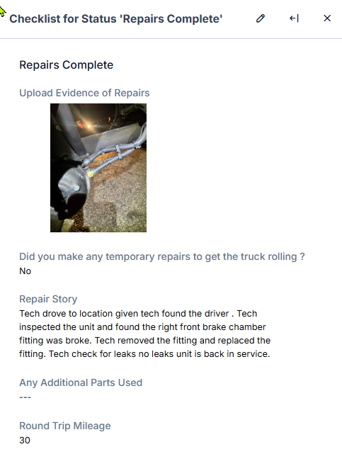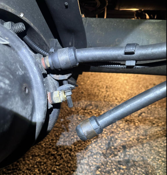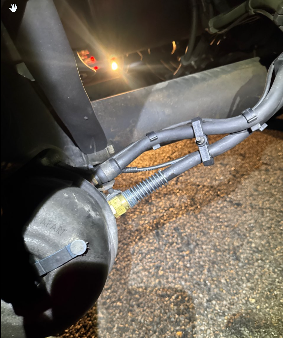 - Confirmed there was an air leak at the right front brake chamber, related to the air line and/or its connection.